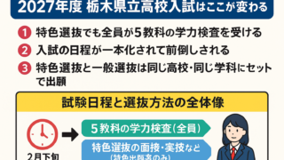 今の中2生2027年度(令和9年度)から栃木県立高校入試の仕組みが大きく変わります。この記事では「何がどう変わるのか」「特色選抜と一般選抜で何が違うのか」解説します。✅ 2027年度 栃木県立高校入試はここが変わるまず押さえるべきポイントは...